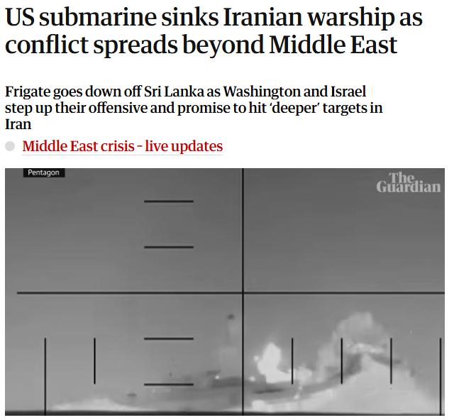 中新网3月5日电 据英国《卫报》4日报道,美国国防部长赫格塞思表示,一艘美国潜艇发射的鱼雷在斯里兰卡南部海岸击沉了一艘伊朗军舰。