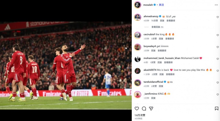 萨拉赫也在赛后更新了社媒,晒出自己向球迷们致意并手抚胸前利物浦队徽的照片。尽管没有附加文字内容,但想要表达的已经溢于言表。